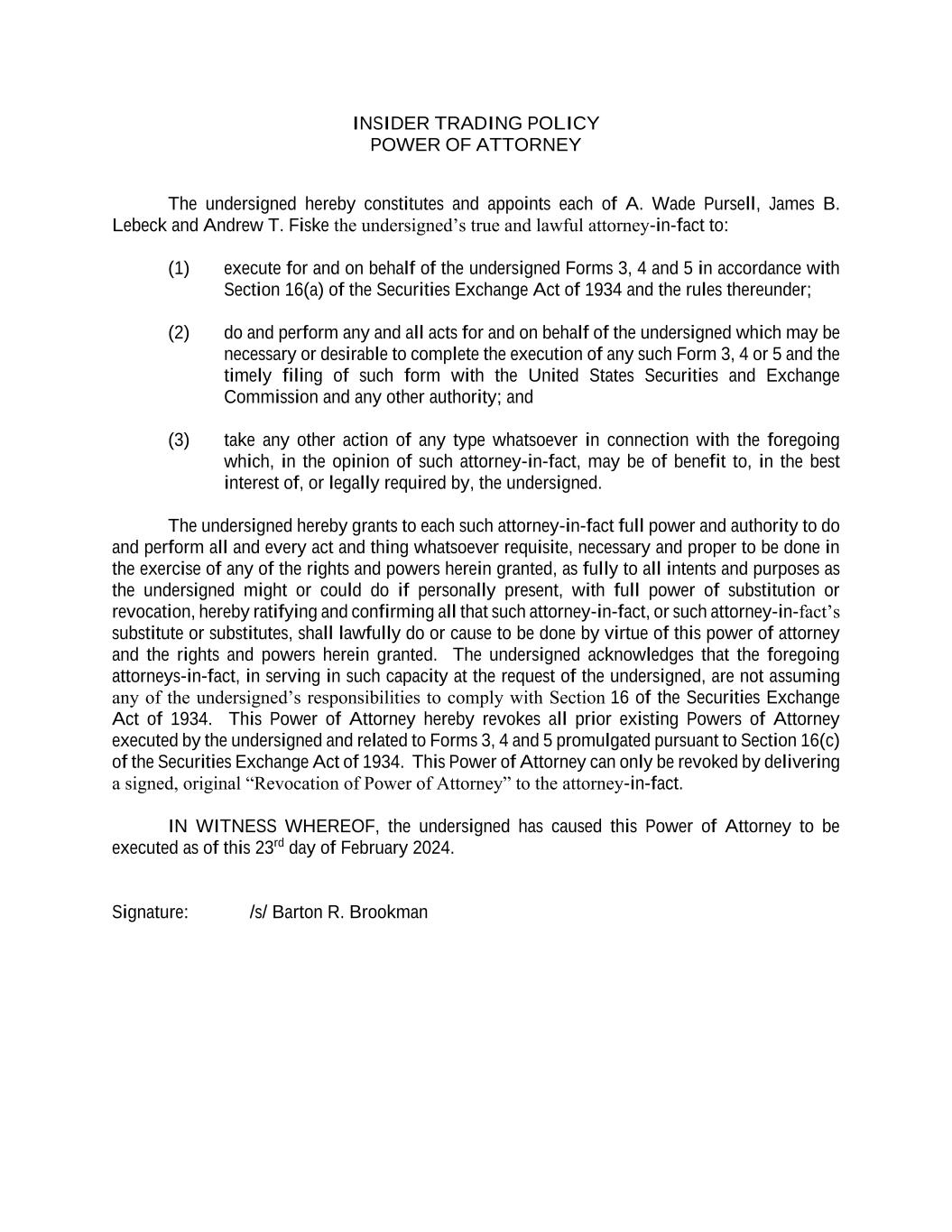 INSIDER TRADING POLICY POWER OF ATTORNEY The undersigned hereby constitutes and appoints each of A. Wade Pursell, James B. Lebeck and Andrew T. Fiske the undersigned’s true and lawful attorney-in-fact to: (1) execute for and on behalf of the undersigned Forms 3, 4 and 5 in accordance with Section 16(a) of the Securities Exchange Act of 1934 and the rules thereunder; (2) do and perform any and all acts for and on behalf of the undersigned which may be necessary or desirable to complete the execution of any such Form 3, 4 or 5 and the timely filing of such form with the United States Securities and Exchange Commission and any other authority; and (3) take any other action of any type whatsoever in connection with the foregoing which, in the opinion of such attorney-in-fact, may be of benefit to, in the best interest of, or legally required by, the undersigned. The undersigned hereby grants to each such attorney-in-fact full power and authority to do and perform all and every act and thing whatsoever requisite, necessary and proper to be done in the exercise of any of the rights and powers herein granted, as fully to all intents and purposes as the undersigned might or could do if personally present, with full power of substitution or revocation, hereby ratifying and confirming all that such attorney-in-fact, or such attorney-in-fact’s substitute or substitutes, shall lawfully do or cause to be done by virtue of this power of attorney and the rights and powers herein granted. The undersigned acknowledges that the foregoing attorneys-in-fact, in serving in such capacity at the request of the undersigned, are not assuming any of the undersigned’s responsibilities to comply with Section 16 of the Securities Exchange Act of 1934. This Power of Attorney hereby revokes all prior existing Powers of Attorney executed by the undersigned and related to Forms 3, 4 and 5 promulgated pursuant to Section 16(c) of the Securities Exchange Act of 1934. This Power of Attorney can only be revoked by delivering a signed, original “Revocation of Power of Attorney” to the attorney-in-fact. IN WITNESS WHEREOF, the undersigned has caused this Power of Attorney to be executed as of this 23rd day of February 2024. Signature: /s/ Barton R. Brookman