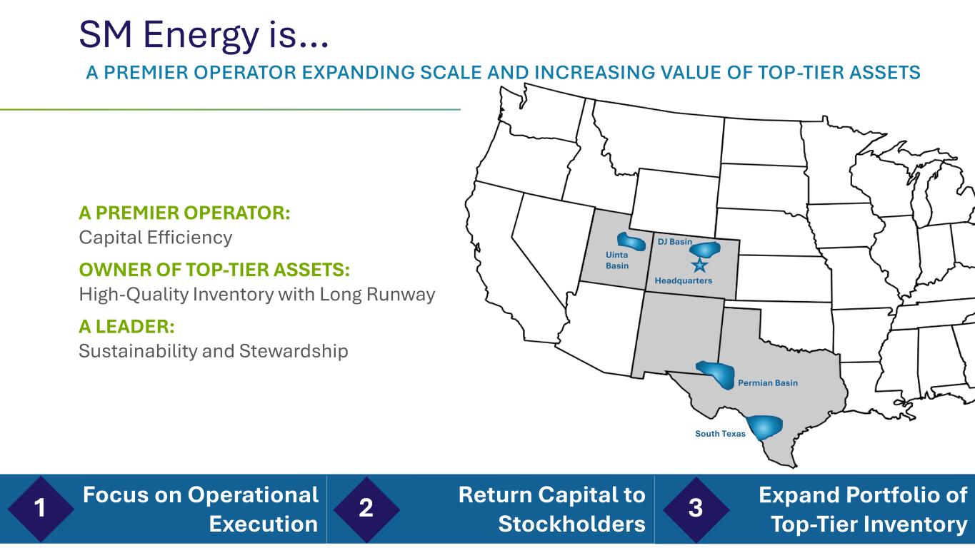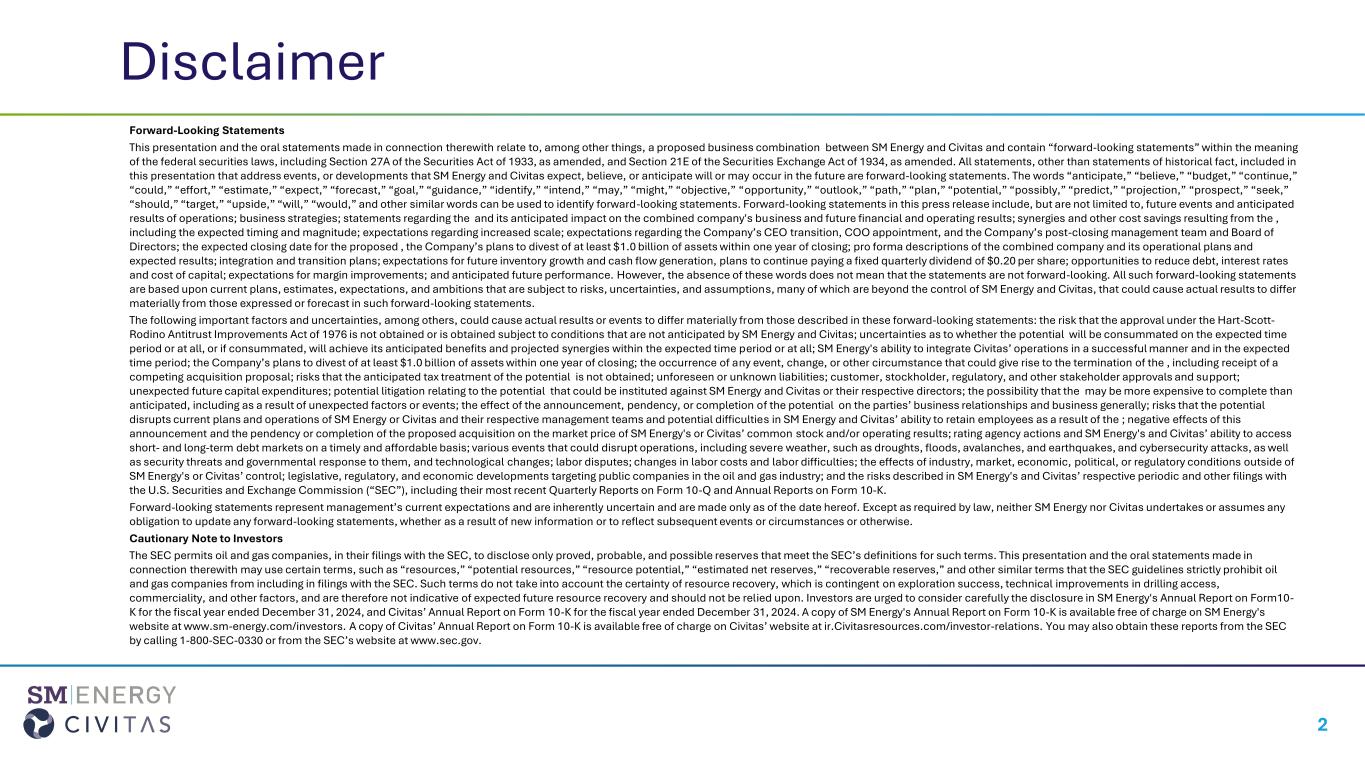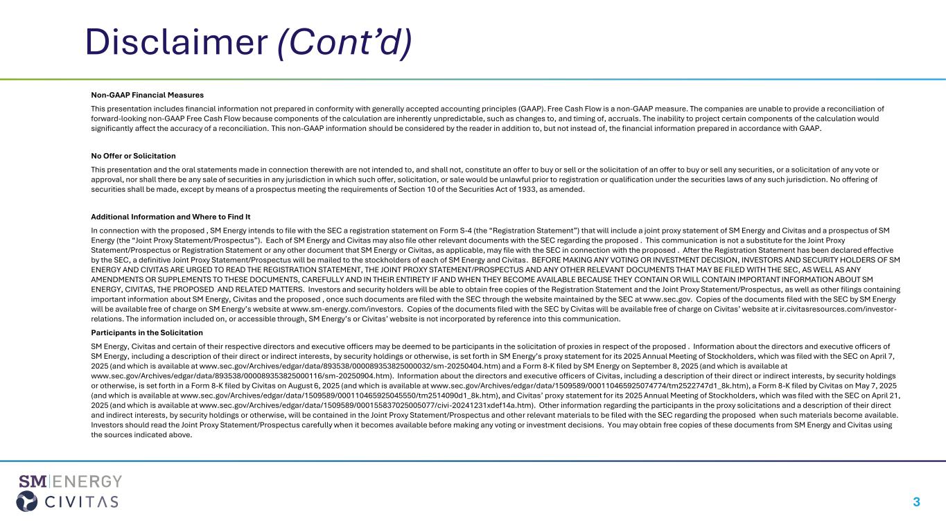 2 Disclaimer Forward-Looking Statements This presentation and the oral statements made in connection therewith relate to, among other things, a proposed business combination between SM Energy and Civitas and contain “forward-looking statements” within the meaning of the federal securities laws, including Section 27A of the Securities Act of 1933, as amended, and Section 21E of the Securities Exchange Act of 1934, as amended. All statements, other than statements of historical fact, included in this presentation that address events, or developments that SM Energy and Civitas expect, believe, or anticipate will or may occur in the future are forward-looking statements. The words “anticipate,” “believe,” “budget,” “continue,” “could,” “effort,” “estimate,” “expect,” “forecast,” “goal,” “guidance,” “identify,” “intend,” “may,” “might,” “objective,” “opportunity,” “outlook,” “path,” “plan,” “potential,” “possibly,” “predict,” “projection,” “prospect,” “seek,” “should,” “target,” “upside,” “will,” “would,” and other similar words can be used to identify forward-looking statements. Forward-looking statements in this press release include, but are not limited to, future events and anticipated results of operations; business strategies; statements regarding the and its anticipated impact on the combined company's business and future financial and operating results; synergies and other cost savings resulting from the , including the expected timing and magnitude; expectations regarding increased scale; expectations regarding the Company’s CEO transition, COO appointment, and the Company’s post-closing management team and Board of Directors; the expected closing date for the proposed , the Company’s plans to divest of at least $1.0 billion of assets within one year of closing; pro forma descriptions of the combined company and its operational plans and expected results; integration and transition plans; expectations for future inventory growth and cash flow generation, plans to continue paying a fixed quarterly dividend of $0.20 per share; opportunities to reduce debt, interest rates and cost of capital; expectations for margin improvements; and anticipated future performance. However, the absence of these words does not mean that the statements are not forward-looking. All such forward-looking statements are based upon current plans, estimates, expectations, and ambitions that are subject to risks, uncertainties, and assumptions, many of which are beyond the control of SM Energy and Civitas, that could cause actual results to differ materially from those expressed or forecast in such forward-looking statements. The following important factors and uncertainties, among others, could cause actual results or events to differ materially from those described in these forward-looking statements: the risk that the approval under the Hart-Scott- Rodino Antitrust Improvements Act of 1976 is not obtained or is obtained subject to conditions that are not anticipated by SM Energy and Civitas; uncertainties as to whether the potential will be consummated on the expected time period or at all, or if consummated, will achieve its anticipated benefits and projected synergies within the expected time period or at all; SM Energy's ability to integrate Civitas’ operations in a successful manner and in the expected time period; the Company’s plans to divest of at least $1.0 billion of assets within one year of closing; the occurrence of any event, change, or other circumstance that could give rise to the termination of the , including receipt of a competing acquisition proposal; risks that the anticipated tax treatment of the potential is not obtained; unforeseen or unknown liabilities; customer, stockholder, regulatory, and other stakeholder approvals and support; unexpected future capital expenditures; potential litigation relating to the potential that could be instituted against SM Energy and Civitas or their respective directors; the possibility that the may be more expensive to complete than anticipated, including as a result of unexpected factors or events; the effect of the announcement, pendency, or completion of the potential on the parties’ business relationships and business generally; risks that the potential disrupts current plans and operations of SM Energy or Civitas and their respective management teams and potential difficulties in SM Energy and Civitas’ ability to retain employees as a result of the ; negative effects of this announcement and the pendency or completion of the proposed acquisition on the market price of SM Energy's or Civitas’ common stock and/or operating results; rating agency actions and SM Energy's and Civitas’ ability to access short- and long-term debt markets on a timely and affordable basis; various events that could disrupt operations, including severe weather, such as droughts, floods, avalanches, and earthquakes, and cybersecurity attacks, as well as security threats and governmental response to them, and technological changes; labor disputes; changes in labor costs and labor difficulties; the effects of industry, market, economic, political, or regulatory conditions outside of SM Energy's or Civitas’ control; legislative, regulatory, and economic developments targeting public companies in the oil and gas industry; and the risks described in SM Energy's and Civitas’ respective periodic and other filings with the U.S. Securities and Exchange Commission (“SEC”), including their most recent Quarterly Reports on Form 10-Q and Annual Reports on Form 10-K. Forward-looking statements represent management’s current expectations and are inherently uncertain and are made only as of the date hereof. Except as required by law, neither SM Energy nor Civitas undertakes or assumes any obligation to update any forward-looking statement