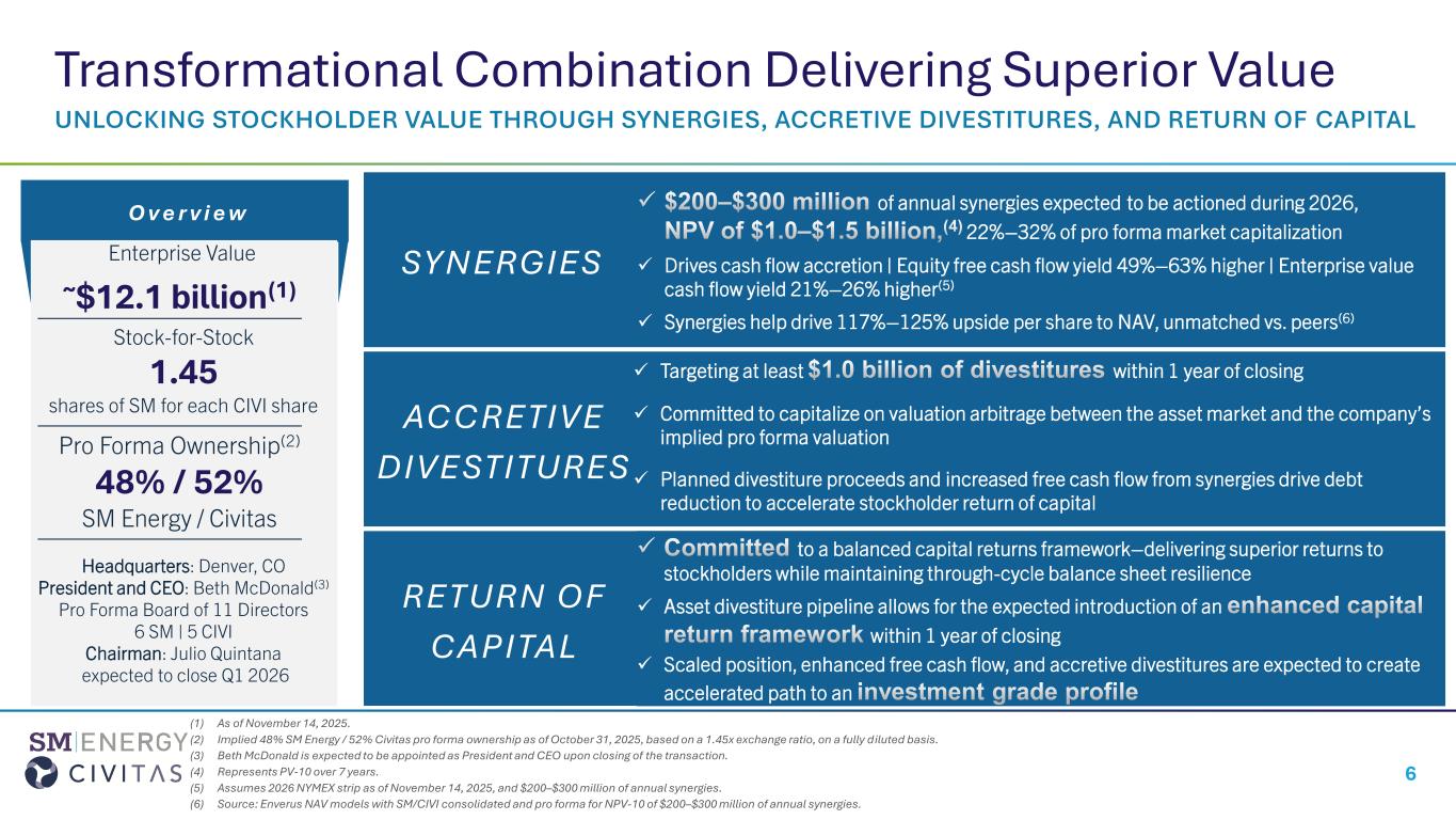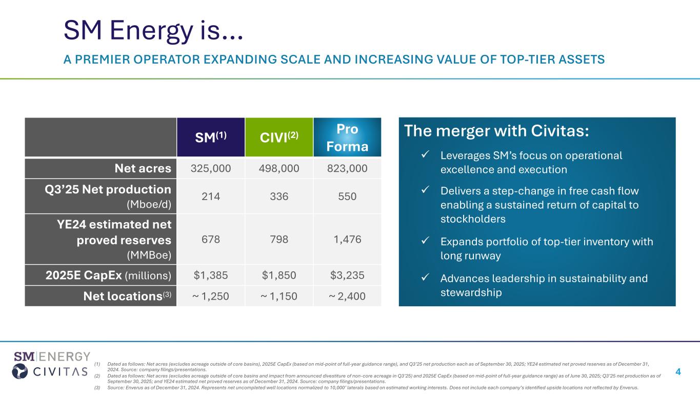 3 Disclaimer (Cont’d) Non-GAAP Financial Measures This presentation includes financial information not prepared in conformity with generally accepted accounting principles (GAAP). Free Cash Flow is a non-GAAP measure. The companies are unable to provide a reconciliation of forward-looking non-GAAP Free Cash Flow because components of the calculation are inherently unpredictable, such as changes to, and timing of, accruals. The inability to project certain components of the calculation would significantly affect the accuracy of a reconciliation. This non-GAAP information should be considered by the reader in addition to, but not instead of, the financial information prepared in accordance with GAAP. No Offer or Solicitation This presentation and the oral statements made in connection therewith are not intended to, and shall not, constitute an offer to buy or sell or the solicitation of an offer to buy or sell any securities, or a solicitation of any vote or approval, nor shall there be any sale of securities in any jurisdiction in which such offer, solicitation, or sale would be unlawful prior to registration or qualification under the securities laws of any such jurisdiction. No offering of securities shall be made, except by means of a prospectus meeting the requirements of Section 10 of the Securities Act of 1933, as amended. Additional Information and Where to Find It In connection with the proposed , SM Energy intends to file with the SEC a registration statement on Form S-4 (the “Registration Statement”) that will include a joint proxy statement of SM Energy and Civitas and a prospectus of SM Energy (the “Joint Proxy Statement/Prospectus”). Each of SM Energy and Civitas may also file other relevant documents with the SEC regarding the proposed . This communication is not a substitute for the Joint Proxy Statement/Prospectus or Registration Statement or any other document that SM Energy or Civitas, as applicable, may file with the SEC in connection with the proposed . After the Registration Statement has been declared effective by the SEC, a definitive Joint Proxy Statement/Prospectus will be mailed to the stockholders of each of SM Energy and Civitas. BEFORE MAKING ANY VOTING OR INVESTMENT DECISION, INVESTORS AND SECURITY HOLDERS OF SM ENERGY AND CIVITAS ARE URGED TO READ THE REGISTRATION STATEMENT, THE JOINT PROXY STATEMENT/PROSPECTUS AND ANY OTHER RELEVANT DOCUMENTS THAT MAY BE FILED WITH THE SEC, AS WELL AS ANY AMENDMENTS OR SUPPLEMENTS TO THESE DOCUMENTS, CAREFULLY AND IN THEIR ENTIRETY IF AND WHEN THEY BECOME AVAILABLE BECAUSE THEY CONTAIN OR WILL CONTAIN IMPORTANT INFORMATION ABOUT SM ENERGY, CIVITAS, THE PROPOSED AND RELATED MATTERS. Investors and security holders will be able to obtain free copies of the Registration Statement and the Joint Proxy Statement/Prospectus, as well as other filings containing important information about SM Energy, Civitas and the proposed , once such documents are filed with the SEC through the website maintained by the SEC at www.sec.gov. Copies of the documents filed with the SEC by SM Energy will be available free of charge on SM Energy’s website at www.sm-energy.com/investors. Copies of the documents filed with the SEC by Civitas will be available free of charge on Civitas’ website at ir.civitasresources.com/investor- relations. The information included on, or accessible through, SM Energy’s or Civitas’ website is not incorporated by reference into this communication. Participants in the Solicitation SM Energy, Civitas and certain of their respective directors and executive officers may be deemed to be participants in the solicitation of proxies in respect of the proposed . Information about the directors and executive officers of SM Energy, including a description of their direct or indirect interests, by security holdings or otherwise, is set forth in SM Energy’s proxy statement for its 2025 Annual Meeting of Stockholders, which was filed with the SEC on April 7, 2025 (and which is available at www.sec.gov/Archives/edgar/data/893538/000089353825000032/sm-20250404.htm) and a Form 8-K filed by SM Energy on September 8, 2025 (and which is available at www.sec.gov/Archives/edgar/data/893538/000089353825000116/sm-20250904.htm). Information about the directors and executive officers of Civitas, including a description of their direct or indirect interests, by security holdings or otherwise, is set forth in a Form 8-K filed by Civitas on August 6, 2025 (and which is available at www.sec.gov/Archives/edgar/data/1509589/000110465925074774/tm2522747d1_8k.htm), a Form 8-K filed by Civitas on May 7, 2025 (and which is available at www.sec.gov/Archives/edgar/data/1509589/000110465925045550/tm2514090d1_8k.htm), and Civitas’ proxy statement for its 2025 Annual Meeting of Stockholders, which was filed with the SEC on April 21, 2025 (and which is available at www.sec.gov/Archives/edgar/data/1509589/000155837025005077/civi-20241231xdef14a.htm). Other information regarding the participants in the proxy solicitations and a description of their direct and indirect interests, by security holdings or otherwise, will be contained in the Joint Proxy Statement/Prospectus and other relevant materials to be filed with the SEC regarding the proposed when such materials become available. Investors should read the Joint Proxy Statement/Prospectus carefully when it becomes available before making any voting or investment decisions. You may obtain free copies of these documents from SM Energy and Civitas using the sources indicated above.