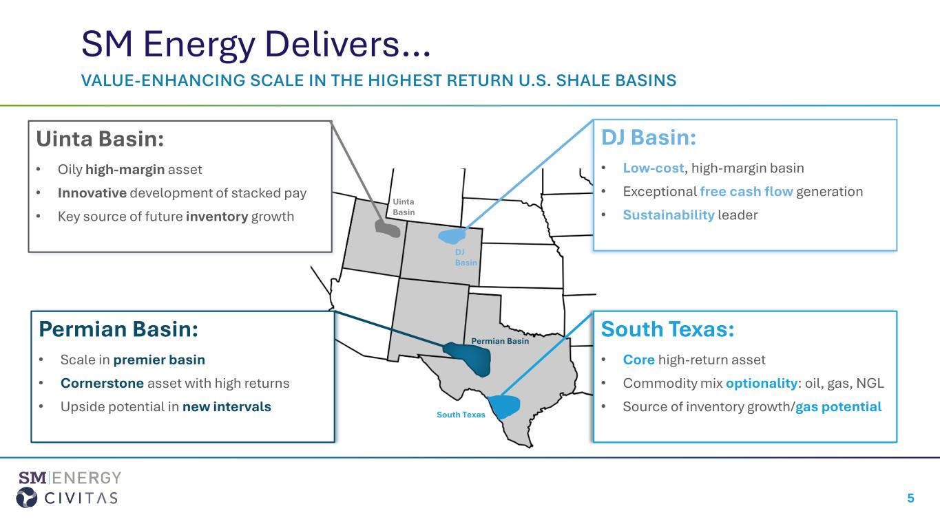 4 SM Energy is… A PREMIER OPERATOR EXPANDING SCALE AND INCREASING VALUE OF TOP-TIER ASSETS (1) Dated as follows: Net acres (excludes acreage outside of core basins), 2025E CapEx (based on mid-point of full-year guidance range), and Q3’25 net production each as of September 30, 2025; YE24 estimated net proved reserves as of December 31, 2024. Source: company filings/presentations. (2) Dated as follows: Net acres (excludes acreage outside of core basins and impact from announced divestiture of non-core acreage in Q3’25) and 2025E CapEx (based on mid-point of full-year guidance range) as of June 30, 2025; Q3’25 net production as of September 30, 2025; and YE24 estimated net proved reserves as of December 31, 2024. Source: company filings/presentations. (3) Source: Enverus as of December 31, 2024. Represents net uncompleted well locations normalized to 10,000’ laterals based on estimated working interests. Does not include each company’s identified upside locations not reflected by Enverus. SM(1) CIVI(2) Pro Forma Net acres 325,000 498,000 823,000 Q3’25 Net production (Mboe/d) 214 336 550 YE24 estimated net proved reserves (MMBoe) 678 798 1,476 2025E CapEx (millions) $1,385 $1,850 $3,235 Net locations(3) ~ 1,250 ~ 1,150 ~ 2,400 The merger with Civitas: ✓ Leverages SM’s focus on operational excellence and execution ✓ Delivers a step-change in free cash flow enabling a sustained return of capital to stockholders ✓ Expands portfolio of top-tier inventory with long runway ✓ Advances leadership in sustainability and stewardship
