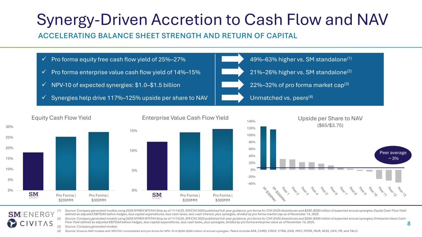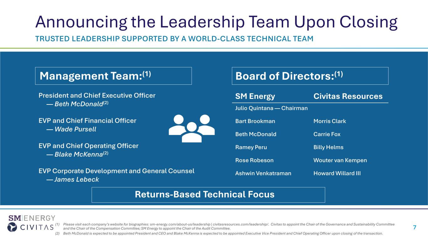 6 Transformational Combination Delivering Superior Value UNLOCKING STOCKHOLDER VALUE THROUGH SYNERGIES, ACCRETIVE DIVESTITURES, AND RETURN OF CAPITAL O v e r v i e w ✓ Significant free cash flow to drive balanced returns framework & acceleration to Investment Grade profile ✓ Immediately accretive to key financial metrics before synergies ACCRETIVE DIVESTITURES Enterprise Value ~$12.1 billion(1) Stock-for-Stock 1.45 shares of SM for each CIVI share Pro Forma Ownership(2) 48% / 52% SM Energy / Civitas Headquarters: Denver, CO President and CEO: Beth McDonald(3) Pro Forma Board of 11 Directors 6 SM | 5 CIVI Chairman: Julio Quintana expected to close Q1 2026 SYNERGIES $200–$300 million of annual synergies expected to be actioned during 2026, NPV of $1.0–$1.5 billion,(4) 22%–32% of pro forma market capitalization ✓ Drives cash flow accretion | Equity free cash flow yield 49%–63% higher | Enterprise value cash flow yield 21%–26% higher(5) ✓ Synergies help drive 117%–125% upside per share to NAV, unmatched vs. peers(6) ✓ Targeting at least $1.0 billion of divestitures within 1 year of closing ✓ Committed to capitalize on valuation arbitrage between the asset market and the company’s implied pro forma valuation ✓ Planned divestiture proceeds and increased free cash flow from synergies drive debt reduction to accelerate stockholder return of capital RETURN OF CAPITAL Committed to a balanced capital returns framework–delivering superior returns to stockholders while maintaining through-cycle balance sheet resilience ✓ Asset divestiture pipeline allows for the expected introduction of an enhanced capital return framework within 1 year of closing ✓ Scaled position, enhanced free cash flow, and accretive divestitures are expected to create accelerated path to an investment grade profile (1) As of November 14, 2025. (2) Implied 48% SM Energy / 52% Civitas pro forma ownership as of October 31, 2025, based on a 1.45x exchange ratio, on a fully diluted basis. (3) Beth McDonald is expected to be appointed as President and CEO upon closing of the transaction. (4) Represents PV-10 over 7 years. (5) Assumes 2026 NYMEX strip as of November 14, 2025, and $200–$300 million of annual synergies. (6) Source: Enverus NAV models with SM/CIVI consolidated and pro forma for NPV-10 of $200–$300 million of annual synergies.