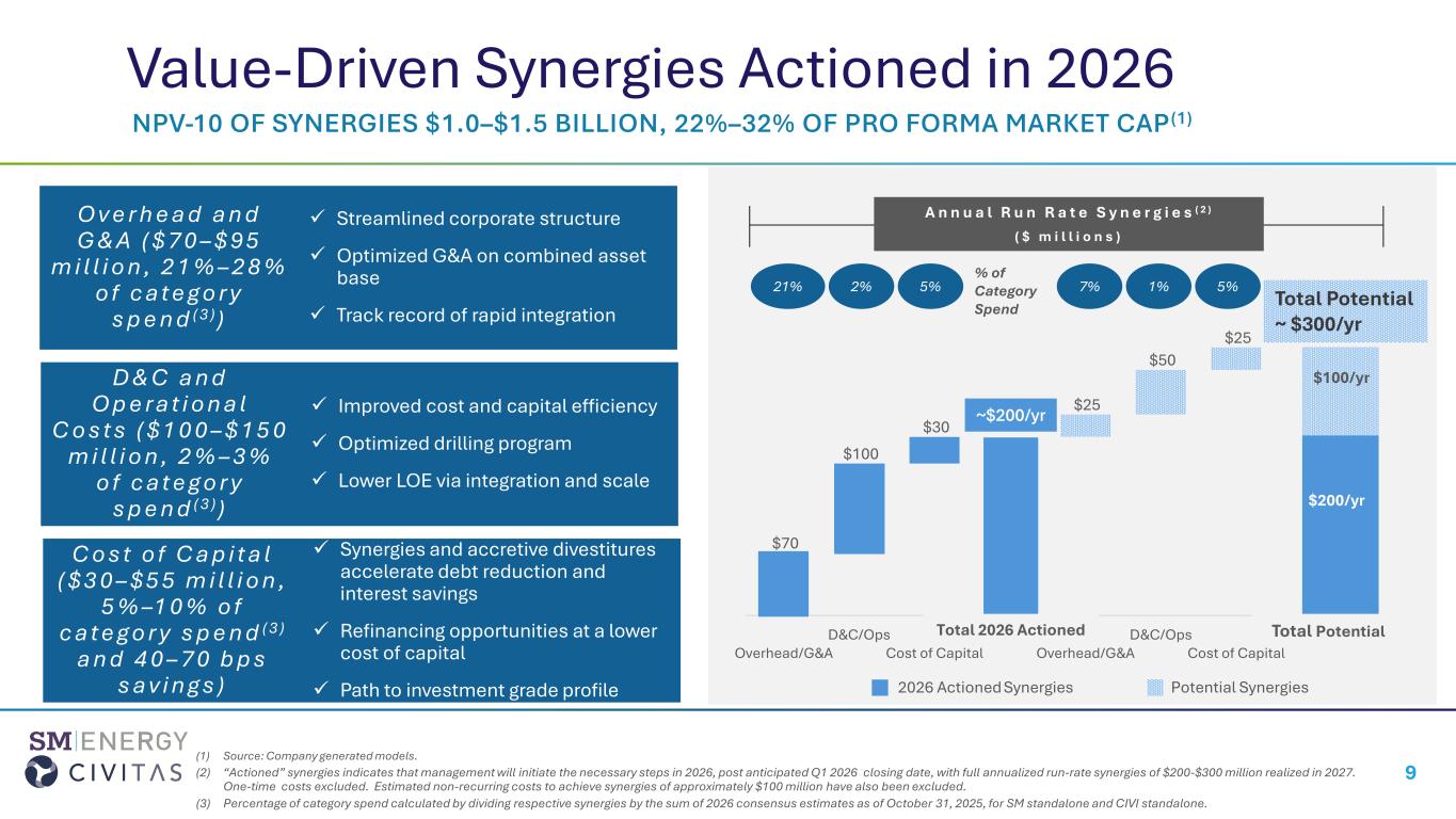 8 Synergy-Driven Accretion to Cash Flow and NAV ACCELERATING BALANCE SHEET STRENGTH AND RETURN OF CAPITAL (1) Source: Company generated models using 2026 NYMEX WTI/HH Strip as of 11/14/25, SM/CIVI 2025 published full-year guidance, pro forma for CIVI 2H25 divestitures and $200–$300 million of expected annual synergies; Equity Cash Flow Yield defined as adjusted EBITDAX before hedges, less capital expenditures, less cash taxes, less cash interest, plus synergies, divided by pro forma market cap as of November 14, 2025. (2) Source: Company generated models using 2026 NYMEX WTI/HH Strip as of 11/14/25, SM/CIVI 2025 published full-year guidance, pro forma for CIVI 2H25 divestitures and $200–$300 million of expected annual synergies; Enterprise Value Cash Flow Yield defined as adjusted EBITDAX before hedges, less capital expenditures, less cash taxes, plus synergies, divided by pro forma enterprise value as of November 14, 2025. (3) Source: Company generated models. (4) Source: Enverus NAV models with SM/CIVI consolidated and pro forma for NPV-10 of $200–$300 million of annual synergies. Peers include APA, CHRD, CRGY, CTRA, DVN, MGY, MTDR, MUR, NOG, OVV, PR, and TALO. ✓ Pro forma equity free cash flow yield of 25%–27% 49%–63% higher vs. SM standalone(1) ✓ Pro forma enterprise value cash flow yield of 14%–15% 21%–26% higher vs. SM standalone(2) ✓ NPV-10 of expected synergies: $1.0–$1.5 billion 22%–32% of pro forma market cap(3) ✓ Synergies help drive 117%–125% upside per share to NAV Unmatched vs. peers(4) 0% 5% 10% 15% SM Pro Forma | $200MM Pro Forma | $300MM Enterprise Value Cash Flow Yield 0% 5% 10% 15% 20% 25% 30% SM Pro Forma | $200MM Pro Forma | $300MM Equity Cash Flow Yield -40% -20% 0% 20% 40% 60% 80% 100% 120% 140% Upside per Share to NAV ($65/$3.75) Peer average ~ 3%