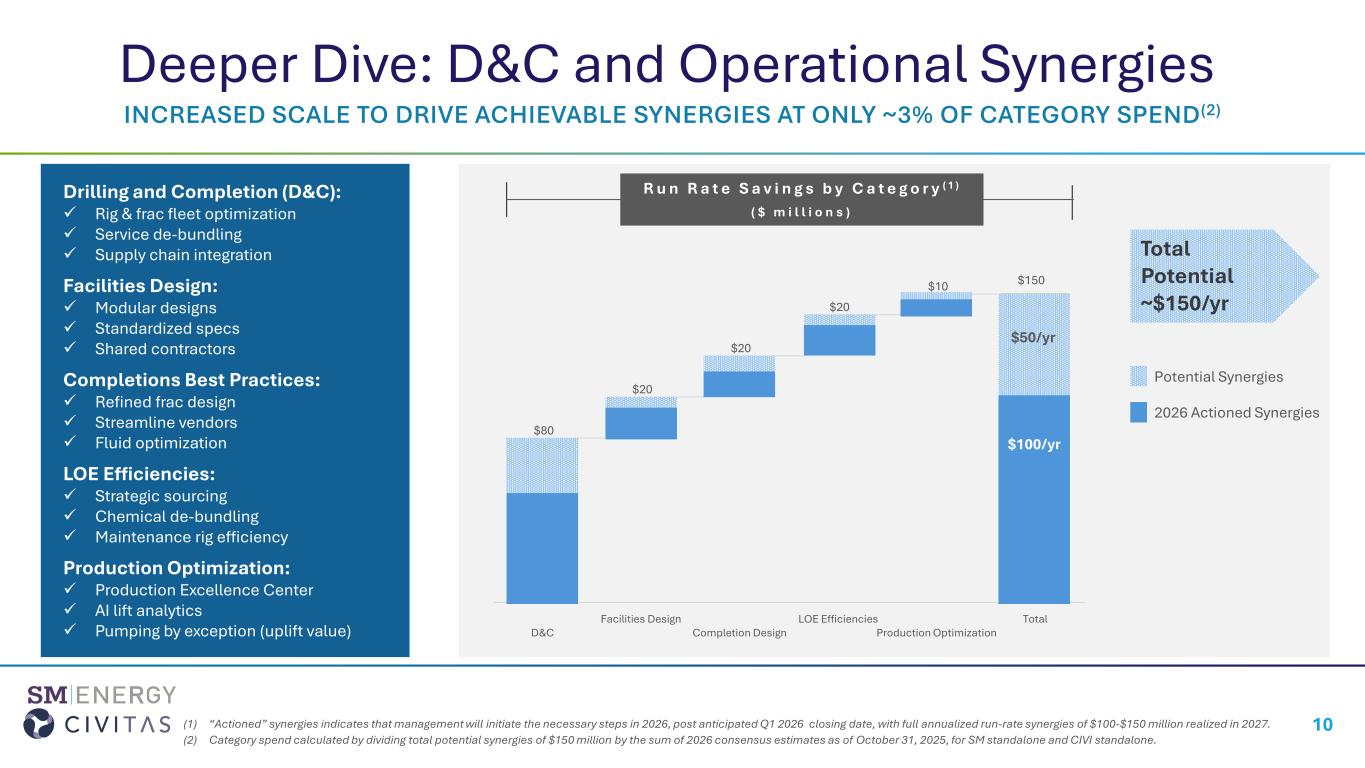 9 Value-Driven Synergies Actioned in 2026 NPV-10 OF SYNERGIES $1.0–$1.5 BILLION, 22%–32% OF PRO FORMA MARKET CAP(1) (1) Source: Company generated models. (2) “Actioned” synergies indicates that management will initiate the necessary steps in 2026, post anticipated Q1 2026 closing date, with full annualized run-rate synergies of $200-$300 million realized in 2027. One-time costs excluded. Estimated non-recurring costs to achieve synergies of approximately $100 million have also been excluded. (3) Percentage of category spend calculated by dividing respective synergies by the sum of 2026 consensus estimates as of October 31, 2025, for SM standalone and CIVI standalone. ✓ Synergies and accretive divestitures accelerate debt reduction and interest savings ✓ Refinancing opportunities at a lower cost of capital ✓ Path to investment grade profile C o s t o f C a p i t a l ( $ 3 0 – $ 5 5 m i l l i o n , 5 % –1 0 % o f c a t e g o r y s p e n d ( 3 ) a n d 4 0 – 7 0 b p s s a v i n g s ) ✓ Streamlined corporate structure ✓ Optimized G&A on combined asset base ✓ Track record of rapid integration O v e r h e a d a n d G & A ( $ 7 0 – $ 9 5 m i l l i o n , 2 1 % – 2 8 % o f c a t e g o r y s p e n d ( 3 )) ✓ Improved cost and capital efficiency ✓ Optimized drilling program ✓ Lower LOE via integration and scale D & C a n d O p e r a t i o n a l C o s t s ( $ 1 0 0 – $ 1 5 0 m i l l i o n , 2 % – 3 % o f c a t e g o r y s p e n d ( 3 )) ~$200/yr A n n u a l R u n R a t e S y n e r g i e s ( 2 ) ( $ m i l l i o n s ) $70 $100 $30 $25 $50 $25 Overhead/G&A D&C/Ops Cost of Capital Total Identified Overhead/G&A D&C/Ops Cost of Capital Total PotentialTotal 2026 Actioned Total Potential Total Potential ~ $300/yr 2026 Actioned Synergies Potential Synergies 21% 2% 5% 7% 1% 5% $200/yr $100/yr % of Category Spend