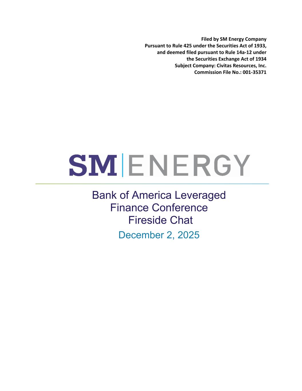 Filed by SM Energy Company Pursuant to Rule 425 under the Securities Act of 1933, and deemed filed pursuant to Rule 14a-12 under the Securities Exchange Act of 1934 Subject Company: Civitas Resources, Inc. Commission File No.: 001-35371 Bank of America Leveraged Finance Conference Fireside Chat December 2, 2025