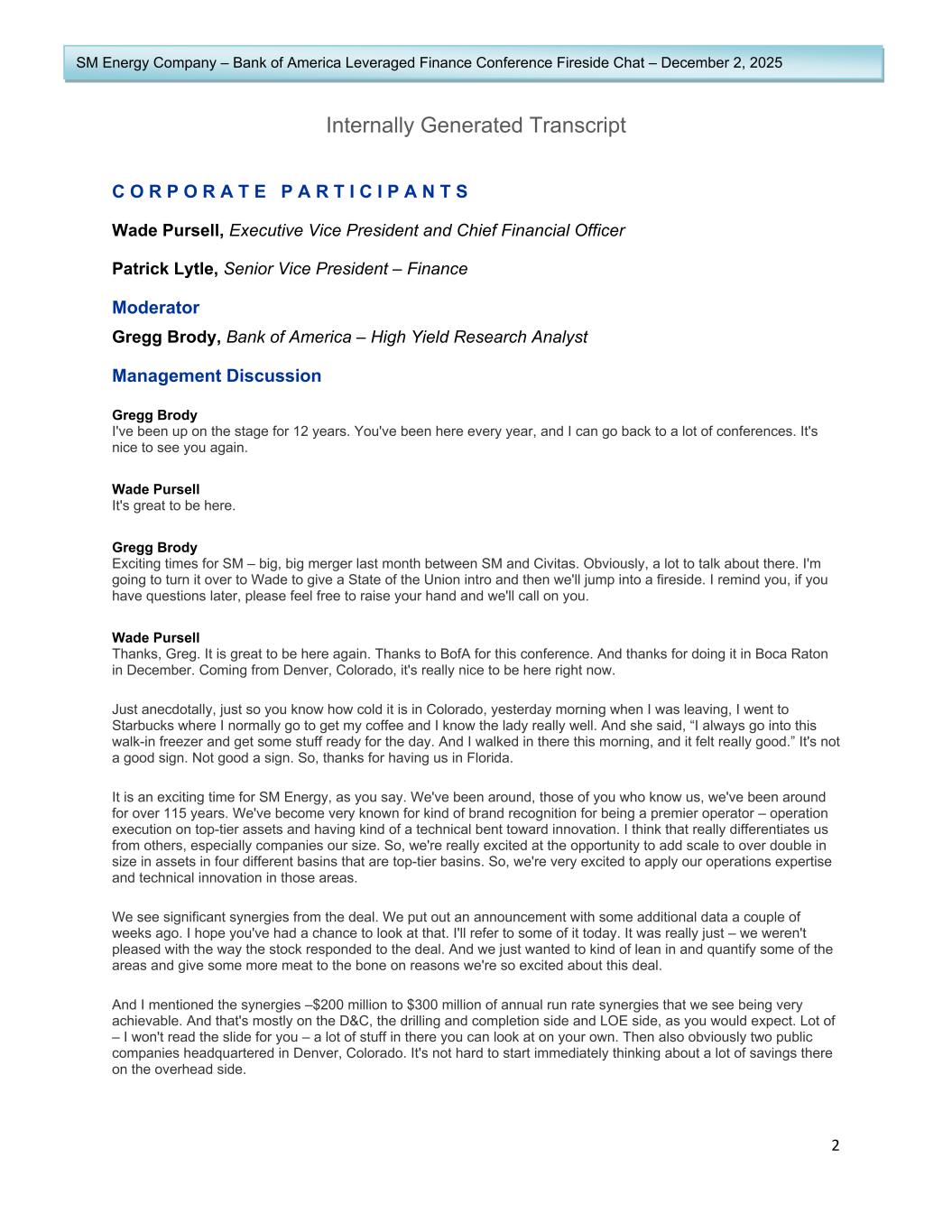 3 SM Energy Company – Bank of America Leveraged Finance Conference Fireside Chat – December 2, 2025 And on the cost capital side, there's going to be significant savings there as well. Didn't really lean in too much on that as far as quantifying a number. You can easily see how, I think we've put $30 million to $40 million or $45 million of savings there. And just thinking about the synergies and reducing debt from those, it's easy to start thinking about cost of capital savings. We talked about divestiture proceeds. I'll say something about that in a second. That would obviously drive savings there as well. But also, just the average borrowing rate. You look at some of the coupons on some of the maturities and you can see how as we refinance those and move along left to right as a larger company, you can easily see a lot of cost of capital savings from this combined entity going forward. Rating agencies were very favorable on the announcement. Two of them even said positive outlook. People love to ask, is this -- does this move you to investment grade? I'm always afraid to speak for the agencies. I think it definitely moves us that direction. Definitely checks a box on the scale side, the diversity side as well, and commodity mix – those kind of things are positive. So, the last point I'll make before we go to Q&A is we did also announce that we'd be targeting $1 billion plus in divestitures within the first year. We think that's very attainable. That would obviously be dedicated to strengthening the balance sheet, accelerating that deleveraging that we really want to do. We – you all know us really well – we try to run the balance sheet in that one times area. We consider that a strong balance sheet. This pro forma moves us kind of up into that mid-ones area, not an uncomfortable area at all, but we’d like to move it back towards the one times area and that's what we'll be focused on doing in the near term. Pro forma company generates a lot of free cash flow. I think if you just look at pro forma this year, it's something in the $1.5 billion area, so that'll be prioritized to debt reduction early on. Divestiture proceeds could accelerate that and we look forward to getting back into that low ones area and prioritizing the free cash flow more to return of capital, stock buybacks, etc. That's my summary. Q&A Session Gregg Brody It's a great start. So, I think we were talking about the – originally you put out the announcement of the transaction – and a couple of weeks later you announced an update. A part of that was because the stock wasn't necessarily trading to reflect the M&A transaction. What's the arb today on that? Is it – do you see any challenges with the deal closing? Wade Pursell I don't see any challenges. I don't, I think it's – I haven't looked at it today or too recently – I think since that announcement, if I'm correct, I think it’s started going back the other direction as far as our stock versus their stock and what that implies for the exchange when we close. So, I don't think there's anything to be overly concerned about at this point. Gregg Brody Do you think you have to announce asset sales prior to the transaction close? Obviously, you can't announce Civitas sales, but... Wade Pursell Can't sell assets we don't own, so that's not going to happen. So, there's no plans to do anything. We're ordinary course of business looking at things all the time. So, that's all I can say on that. Gregg Brody The potential sales, there's a headline of weeks ago about Eagle Ford possibly for sale. I'm curious what's on the table and what might not be? Wade Pursell Well, as you would expect, I can't answer that too directly, too specifically. We love all of our assets. I start by saying that, for different reasons. As far as when we think about divestiture candidates – there's a lot of factors that go into that, that we would consider. It would be things like PDP component versus inventory upside – you can imagine that being a consideration. Commodity mix is a consideration, gas versus oil, where we are in the cycle, those kind of things, which probably led some to speculate on the Eagle Ford having that gas mix that we have there. Regulatory
