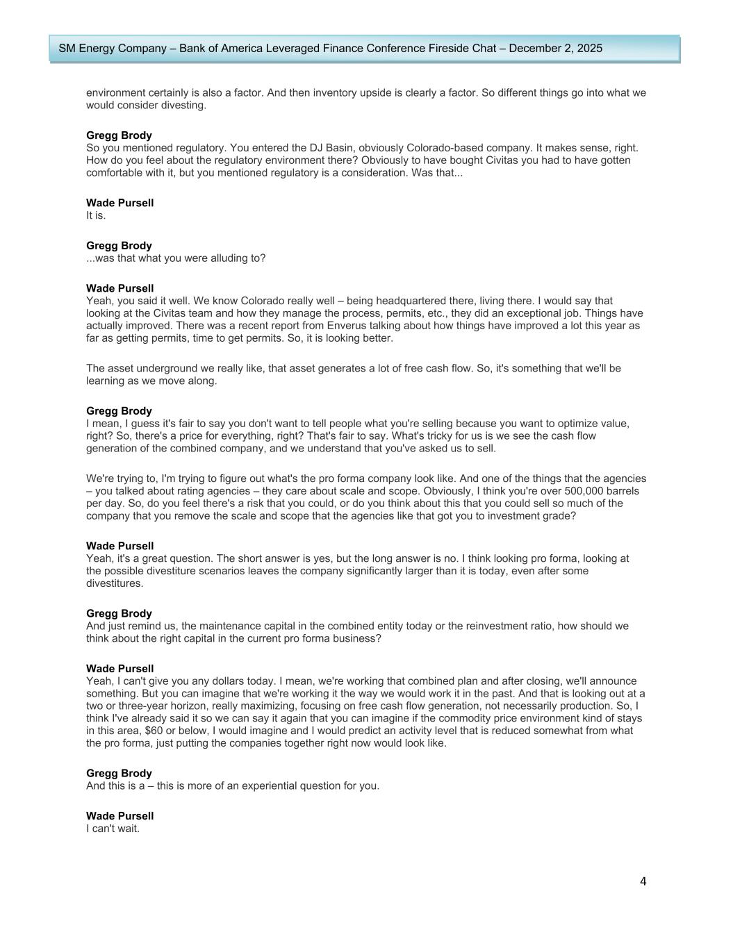 4 SM Energy Company – Bank of America Leveraged Finance Conference Fireside Chat – December 2, 2025 environment certainly is also a factor. And then inventory upside is clearly a factor. So different things go into what we would consider divesting. Gregg Brody So you mentioned regulatory. You entered the DJ Basin, obviously Colorado-based company. It makes sense, right. How do you feel about the regulatory environment there? Obviously to have bought Civitas you had to have gotten comfortable with it, but you mentioned regulatory is a consideration. Was that... Wade Pursell It is. Gregg Brody ...was that what you were alluding to? Wade Pursell Yeah, you said it well. We know Colorado really well – being headquartered there, living there. I would say that looking at the Civitas team and how they manage the process, permits, etc., they did an exceptional job. Things have actually improved. There was a recent report from Enverus talking about how things have improved a lot this year as far as getting permits, time to get permits. So, it is looking better. The asset underground we really like, that asset generates a lot of free cash flow. So, it's something that we'll be learning as we move along. Gregg Brody I mean, I guess it's fair to say you don't want to tell people what you're selling because you want to optimize value, right? So, there's a price for everything, right? That's fair to say. What's tricky for us is we see the cash flow generation of the combined company, and we understand that you've asked us to sell. We're trying to, I'm trying to figure out what's the pro forma company look like. And one of the things that the agencies – you talked about rating agencies – they care about scale and scope. Obviously, I think you're over 500,000 barrels per day. So, do you feel there's a risk that you could, or do you think about this that you could sell so much of the company that you remove the scale and scope that the agencies like that got you to investment grade? Wade Pursell Yeah, it's a great question. The short answer is yes, but the long answer is no. I think looking pro forma, looking at the possible divestiture scenarios leaves the company significantly larger than it is today, even after some divestitures. Gregg Brody And just remind us, the maintenance capital in the combined entity today or the reinvestment ratio, how should we think about the right capital in the current pro forma business? Wade Pursell Yeah, I can't give you any dollars today. I mean, we're working that combined plan and after closing, we'll announce something. But you can imagine that we're working it the way we would work it in the past. And that is looking out at a two or three-year horizon, really maximizing, focusing on free cash flow generation, not necessarily production. So, I think I've already said it so we can say it again that you can imagine if the commodity price environment kind of stays in this area, $60 or below, I would imagine and I would predict an activity level that is reduced somewhat from what the pro forma, just putting the companies together right now would look like. Gregg Brody And this is a – this is more of an experiential question for you. Wade Pursell I can't wait.