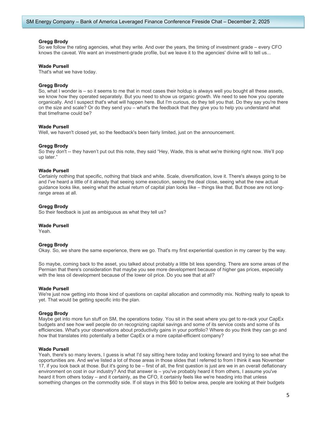 5 SM Energy Company – Bank of America Leveraged Finance Conference Fireside Chat – December 2, 2025 Gregg Brody So we follow the rating agencies, what they write. And over the years, the timing of investment grade – every CFO knows the caveat. We want an investment-grade profile, but we leave it to the agencies' divine will to tell us... Wade Pursell That's what we have today. Gregg Brody So, what I wonder is – so it seems to me that in most cases their holdup is always well you bought all these assets, we know how they operated separately. But you need to show us organic growth. We need to see how you operate organically. And I suspect that's what will happen here. But I'm curious, do they tell you that. Do they say you're there on the size and scale? Or do they send you – what's the feedback that they give you to help you understand what that timeframe could be? Wade Pursell Well, we haven't closed yet, so the feedback's been fairly limited, just on the announcement. Gregg Brody So they don't -- they haven’t put out this note, they said “Hey, Wade, this is what we're thinking right now. We’ll pop up later.” Wade Pursell Certainly nothing that specific, nothing that black and white. Scale, diversification, love it. There's always going to be and I've heard a little of it already that seeing some execution, seeing the deal close, seeing what the new actual guidance looks like, seeing what the actual return of capital plan looks like – things like that. But those are not long- range areas at all. Gregg Brody So their feedback is just as ambiguous as what they tell us? Wade Pursell Yeah. Gregg Brody Okay. So, we share the same experience, there we go. That's my first experiential question in my career by the way. So maybe, coming back to the asset, you talked about probably a little bit less spending. There are some areas of the Permian that there's consideration that maybe you see more development because of higher gas prices, especially with the less oil development because of the lower oil price. Do you see that at all? Wade Pursell We're just now getting into those kind of questions on capital allocation and commodity mix. Nothing really to speak to yet. That would be getting specific into the plan. Gregg Brody Maybe get into more fun stuff on SM, the operations today. You sit in the seat where you get to re-rack your CapEx budgets and see how well people do on recognizing capital savings and some of its service costs and some of its efficiencies. What's your observations about productivity gains in your portfolio? Where do you think they can go and how that translates into potentially a better CapEx or a more capital-efficient company? Wade Pursell Yeah, there's so many levers, I guess is what I'd say sitting here today and looking forward and trying to see what the opportunities are. And we've listed a lot of those areas in those slides that I referred to from I think it was November 17, if you look back at those. But it's going to be – first of all, the first question is just are we in an overall deflationary environment on cost in our industry? And that answer is – you've probably heard it from others, I assume you've heard it from others today – and it certainly, as the CFO, it certainly feels like we're heading into that unless something changes on the commodity side. If oil stays in this $60 to below area, people are looking at their budgets