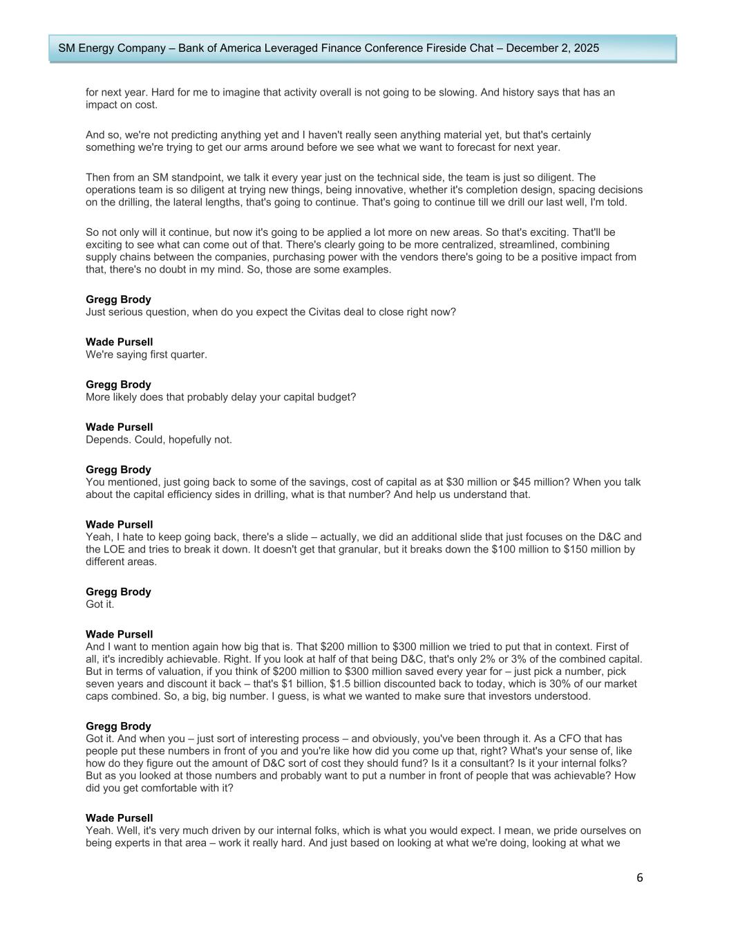 6 SM Energy Company – Bank of America Leveraged Finance Conference Fireside Chat – December 2, 2025 for next year. Hard for me to imagine that activity overall is not going to be slowing. And history says that has an impact on cost. And so, we're not predicting anything yet and I haven't really seen anything material yet, but that's certainly something we're trying to get our arms around before we see what we want to forecast for next year. Then from an SM standpoint, we talk it every year just on the technical side, the team is just so diligent. The operations team is so diligent at trying new things, being innovative, whether it's completion design, spacing decisions on the drilling, the lateral lengths, that's going to continue. That's going to continue till we drill our last well, I'm told. So not only will it continue, but now it's going to be applied a lot more on new areas. So that's exciting. That'll be exciting to see what can come out of that. There's clearly going to be more centralized, streamlined, combining supply chains between the companies, purchasing power with the vendors there's going to be a positive impact from that, there's no doubt in my mind. So, those are some examples. Gregg Brody Just serious question, when do you expect the Civitas deal to close right now? Wade Pursell We're saying first quarter. Gregg Brody More likely does that probably delay your capital budget? Wade Pursell Depends. Could, hopefully not. Gregg Brody You mentioned, just going back to some of the savings, cost of capital as at $30 million or $45 million? When you talk about the capital efficiency sides in drilling, what is that number? And help us understand that. Wade Pursell Yeah, I hate to keep going back, there's a slide – actually, we did an additional slide that just focuses on the D&C and the LOE and tries to break it down. It doesn't get that granular, but it breaks down the $100 million to $150 million by different areas. Gregg Brody Got it. Wade Pursell And I want to mention again how big that is. That $200 million to $300 million we tried to put that in context. First of all, it's incredibly achievable. Right. If you look at half of that being D&C, that's only 2% or 3% of the combined capital. But in terms of valuation, if you think of $200 million to $300 million saved every year for – just pick a number, pick seven years and discount it back – that's $1 billion, $1.5 billion discounted back to today, which is 30% of our market caps combined. So, a big, big number. I guess, is what we wanted to make sure that investors understood. Gregg Brody Got it. And when you – just sort of interesting process – and obviously, you've been through it. As a CFO that has people put these numbers in front of you and you're like how did you come up that, right? What's your sense of, like how do they figure out the amount of D&C sort of cost they should fund? Is it a consultant? Is it your internal folks? But as you looked at those numbers and probably want to put a number in front of people that was achievable? How did you get comfortable with it? Wade Pursell Yeah. Well, it's very much driven by our internal folks, which is what you would expect. I mean, we pride ourselves on being experts in that area – work it really hard. And just based on looking at what we're doing, looking at what we