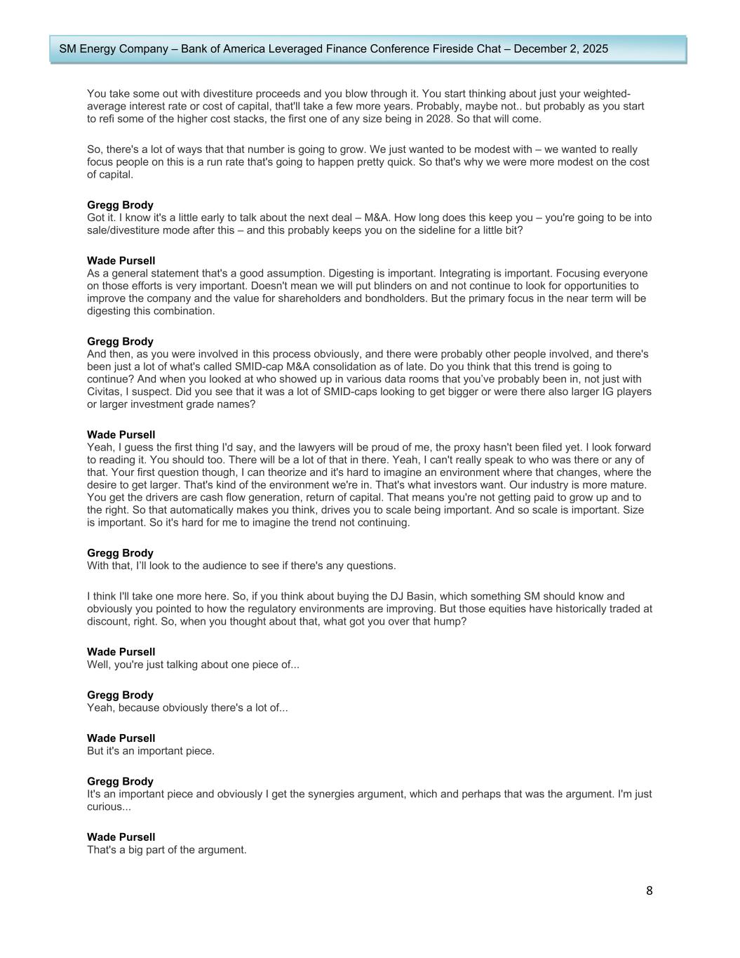 8 SM Energy Company – Bank of America Leveraged Finance Conference Fireside Chat – December 2, 2025 You take some out with divestiture proceeds and you blow through it. You start thinking about just your weighted- average interest rate or cost of capital, that'll take a few more years. Probably, maybe not.. but probably as you start to refi some of the higher cost stacks, the first one of any size being in 2028. So that will come. So, there's a lot of ways that that number is going to grow. We just wanted to be modest with – we wanted to really focus people on this is a run rate that's going to happen pretty quick. So that's why we were more modest on the cost of capital. Gregg Brody Got it. I know it's a little early to talk about the next deal – M&A. How long does this keep you – you're going to be into sale/divestiture mode after this – and this probably keeps you on the sideline for a little bit? Wade Pursell As a general statement that's a good assumption. Digesting is important. Integrating is important. Focusing everyone on those efforts is very important. Doesn't mean we will put blinders on and not continue to look for opportunities to improve the company and the value for shareholders and bondholders. But the primary focus in the near term will be digesting this combination. Gregg Brody And then, as you were involved in this process obviously, and there were probably other people involved, and there's been just a lot of what's called SMID-cap M&A consolidation as of late. Do you think that this trend is going to continue? And when you looked at who showed up in various data rooms that you’ve probably been in, not just with Civitas, I suspect. Did you see that it was a lot of SMID-caps looking to get bigger or were there also larger IG players or larger investment grade names? Wade Pursell Yeah, I guess the first thing I'd say, and the lawyers will be proud of me, the proxy hasn't been filed yet. I look forward to reading it. You should too. There will be a lot of that in there. Yeah, I can't really speak to who was there or any of that. Your first question though, I can theorize and it's hard to imagine an environment where that changes, where the desire to get larger. That's kind of the environment we're in. That's what investors want. Our industry is more mature. You get the drivers are cash flow generation, return of capital. That means you're not getting paid to grow up and to the right. So that automatically makes you think, drives you to scale being important. And so scale is important. Size is important. So it's hard for me to imagine the trend not continuing. Gregg Brody With that, I’ll look to the audience to see if there's any questions. I think I'll take one more here. So, if you think about buying the DJ Basin, which something SM should know and obviously you pointed to how the regulatory environments are improving. But those equities have historically traded at discount, right. So, when you thought about that, what got you over that hump? Wade Pursell Well, you're just talking about one piece of... Gregg Brody Yeah, because obviously there's a lot of... Wade Pursell But it's an important piece. Gregg Brody It's an important piece and obviously I get the synergies argument, which and perhaps that was the argument. I'm just curious... Wade Pursell That's a big part of the argument.