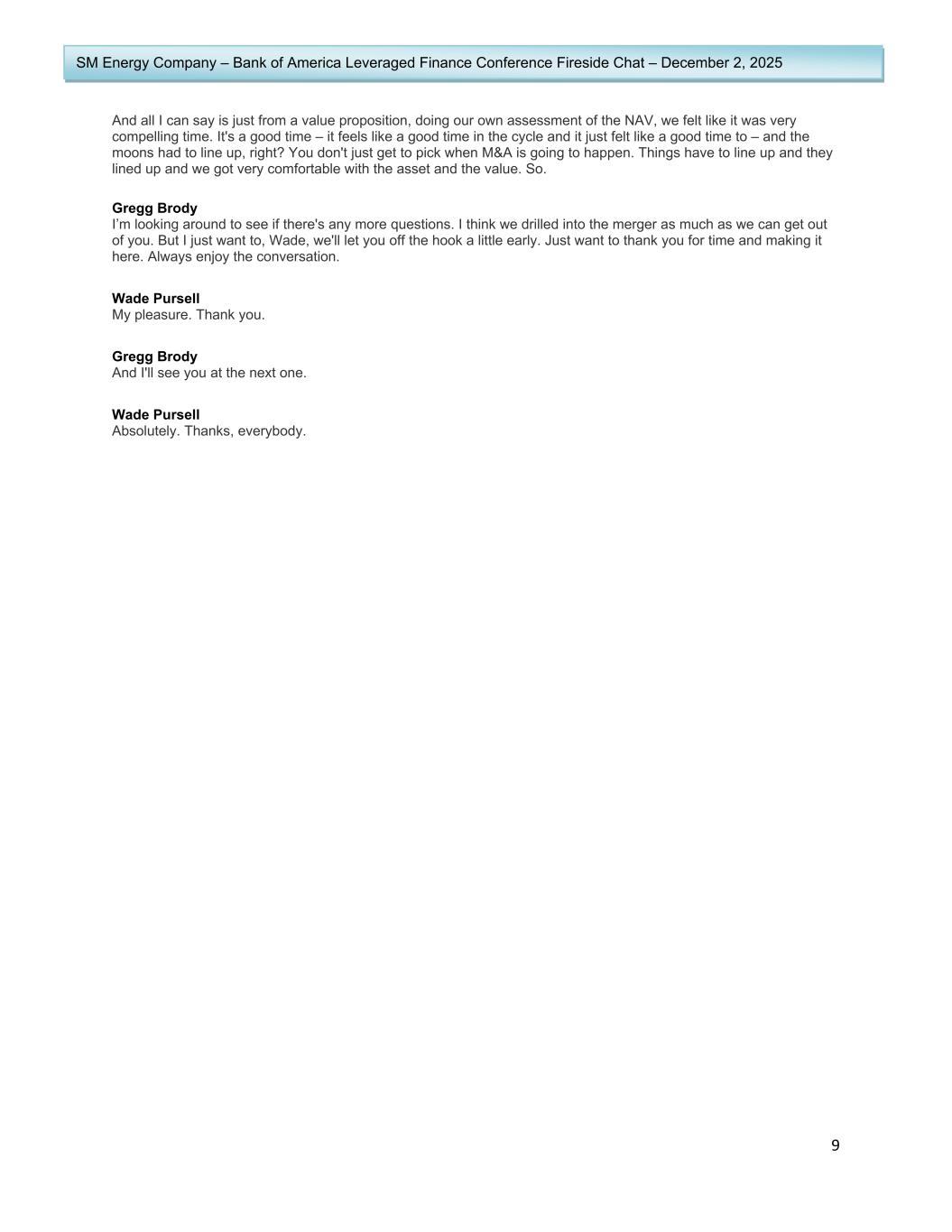 9 SM Energy Company – Bank of America Leveraged Finance Conference Fireside Chat – December 2, 2025 And all I can say is just from a value proposition, doing our own assessment of the NAV, we felt like it was very compelling time. It's a good time – it feels like a good time in the cycle and it just felt like a good time to – and the moons had to line up, right? You don't just get to pick when M&A is going to happen. Things have to line up and they lined up and we got very comfortable with the asset and the value. So. Gregg Brody I’m looking around to see if there's any more questions. I think we drilled into the merger as much as we can get out of you. But I just want to, Wade, we'll let you off the hook a little early. Just want to thank you for time and making it here. Always enjoy the conversation. Wade Pursell My pleasure. Thank you. Gregg Brody And I'll see you at the next one. Wade Pursell Absolutely. Thanks, everybody.