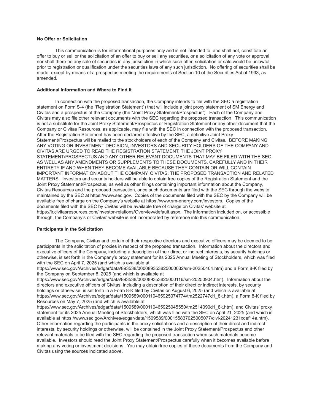 No Offer or Solicitation This communication is for informational purposes only and is not intended to, and shall not, constitute an offer to buy or sell or the solicitation of an offer to buy or sell any securities, or a solicitation of any vote or approval, nor shall there be any sale of securities in any jurisdiction in which such offer, solicitation or sale would be unlawful prior to registration or qualification under the securities laws of any such jurisdiction. No offering of securities shall be made, except by means of a prospectus meeting the requirements of Section 10 of the Securities Act of 1933, as amended. Additional Information and Where to Find It In connection with the proposed transaction, the Company intends to file with the SEC a registration statement on Form S-4 (the “Registration Statement”) that will include a joint proxy statement of SM Energy and Civitas and a prospectus of the Company (the “Joint Proxy Statement/Prospectus”). Each of the Company and Civitas may also file other relevant documents with the SEC regarding the proposed transaction. This communication is not a substitute for the Joint Proxy Statement/Prospectus or Registration Statement or any other document that the Company or Civitas Resources, as applicable, may file with the SEC in connection with the proposed transaction. After the Registration Statement has been declared effective by the SEC, a definitive Joint Proxy Statement/Prospectus will be mailed to the stockholders of each of the Company and Civitas. BEFORE MAKING ANY VOTING OR INVESTMENT DECISION, INVESTORS AND SECURITY HOLDERS OF THE COMPANY AND CIVITAS ARE URGED TO READ THE REGISTRATION STATEMENT, THE JOINT PROXY STATEMENT/PROSPECTUS AND ANY OTHER RELEVANT DOCUMENTS THAT MAY BE FILED WITH THE SEC, AS WELL AS ANY AMENDMENTS OR SUPPLEMENTS TO THESE DOCUMENTS, CAREFULLY AND IN THEIR ENTIRETY IF AND WHEN THEY BECOME AVAILABLE BECAUSE THEY CONTAIN OR WILL CONTAIN IMPORTANT INFORMATION ABOUT THE COMPANY, CIVITAS, THE PROPOSED TRANSACTION AND RELATED MATTERS. Investors and security holders will be able to obtain free copies of the Registration Statement and the Joint Proxy Statement/Prospectus, as well as other filings containing important information about the Company, Civitas Resources and the proposed transaction, once such documents are filed with the SEC through the website maintained by the SEC at https://www.sec.gov. Copies of the documents filed with the SEC by the Company will be available free of charge on the Company’s website at https://www.sm-energy.com/investors. Copies of the documents filed with the SEC by Civitas will be available free of charge on Civitas’ website at https://ir.civitasresources.com/investor-relations/Overview/default.aspx. The information included on, or accessible through, the Company’s or Civitas’ website is not incorporated by reference into this communication. Participants in the Solicitation The Company, Civitas and certain of their respective directors and executive officers may be deemed to be participants in the solicitation of proxies in respect of the proposed transaction. Information about the directors and executive officers of the Company, including a description of their direct or indirect interests, by security holdings or otherwise, is set forth in the Company’s proxy statement for its 2025 Annual Meeting of Stockholders, which was filed with the SEC on April 7, 2025 (and which is available at https://www.sec.gov/Archives/edgar/data/893538/000089353825000032/sm-20250404.htm) and a Form 8-K filed by the Company on September 8, 2025 (and which is available at https://www.sec.gov/Archives/edgar/data/893538/000089353825000116/sm-20250904.htm). Information about the directors and executive officers of Civitas, including a description of their direct or indirect interests, by security holdings or otherwise, is set forth in a Form 8-K filed by Civitas on August 6, 2025 (and which is available at https://www.sec.gov/Archives/edgar/data/1509589/000110465925074774/tm2522747d1_8k.htm), a Form 8-K filed by Resources on May 7, 2025 (and which is available at https://www.sec.gov/Archives/edgar/data/1509589/000110465925045550/tm2514090d1_8k.htm), and Civitas’ proxy statement for its 2025 Annual Meeting of Stockholders, which was filed with the SEC on April 21, 2025 (and which is available at https://www.sec.gov/Archives/edgar/data/1509589/000155837025005077/civi-20241231xdef14a.htm). Other information regarding the participants in the proxy solicitations and a description of their direct and indirect interests, by security holdings or otherwise, will be contained in the Joint Proxy Statement/Prospectus and other relevant materials to be filed with the SEC regarding the proposed transaction when such materials become available. Investors should read the Joint Proxy Statement/Prospectus carefully when it becomes available before making any voting or investment decisions. You may obtain free copies of these documents from the Company and Civitas using the sources indicated above.